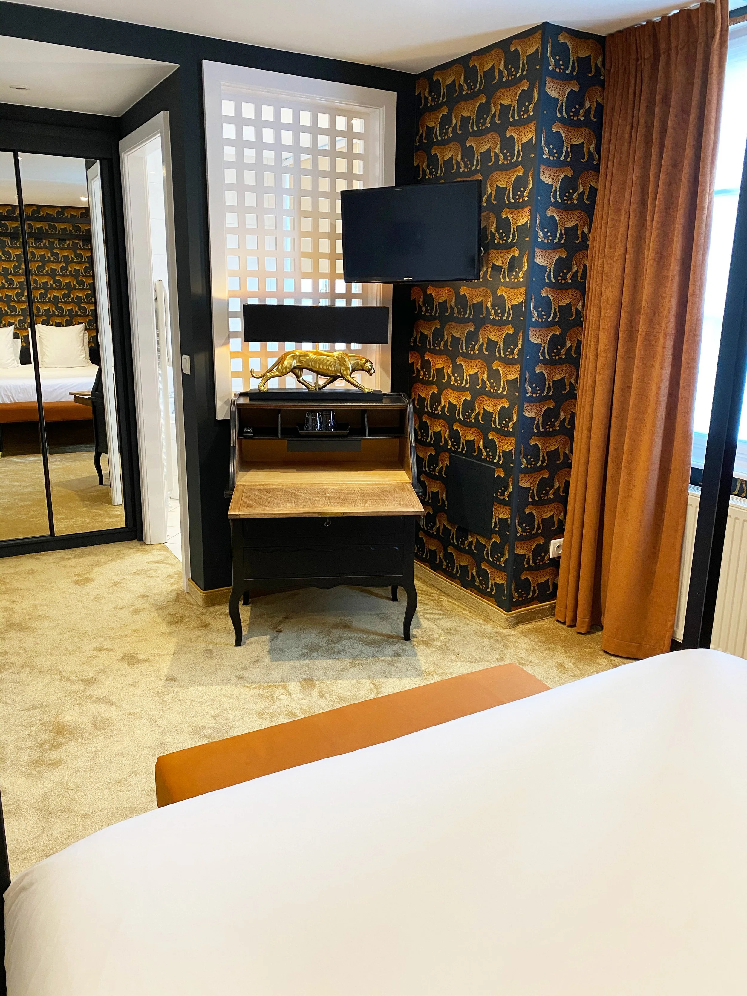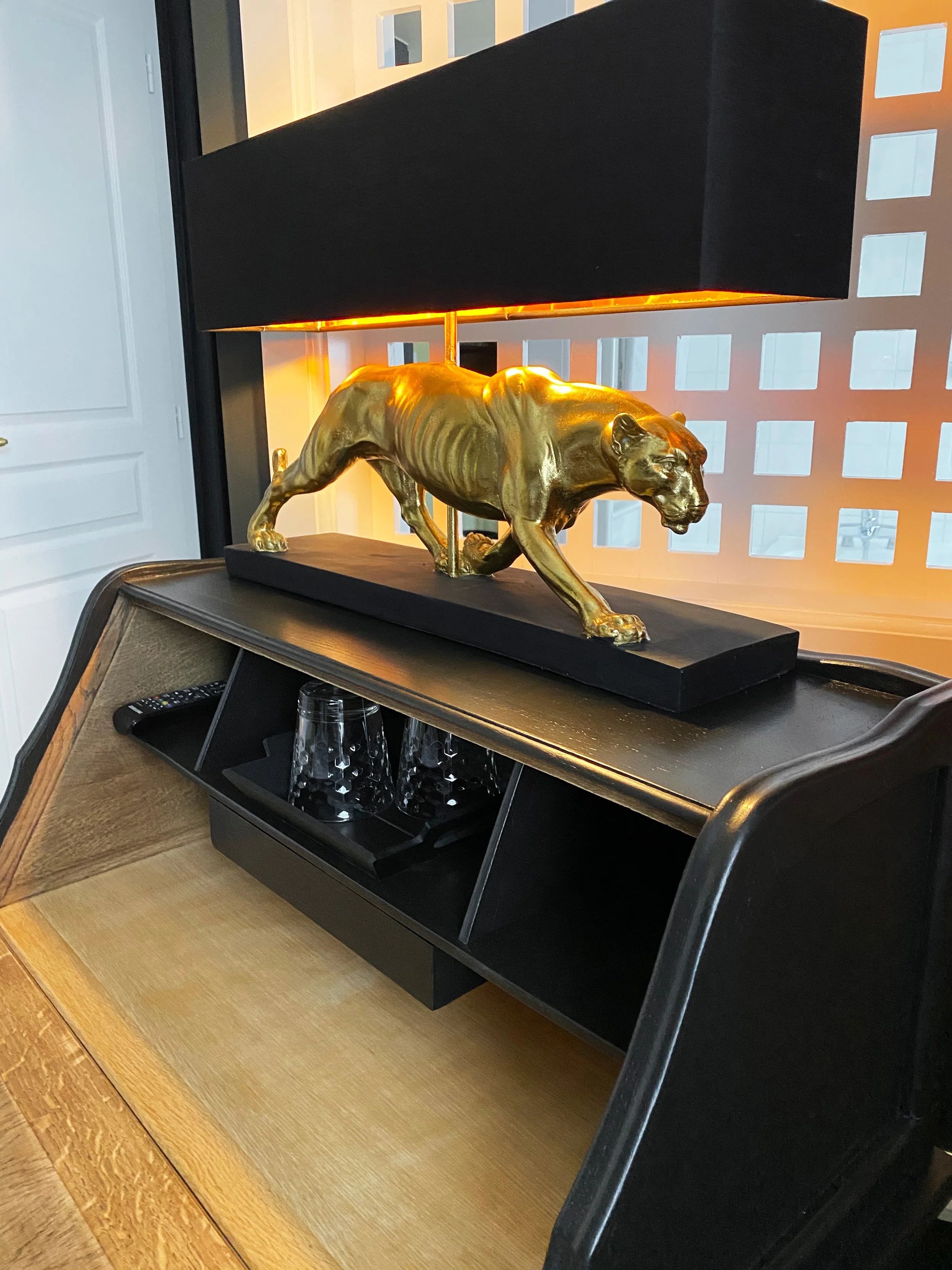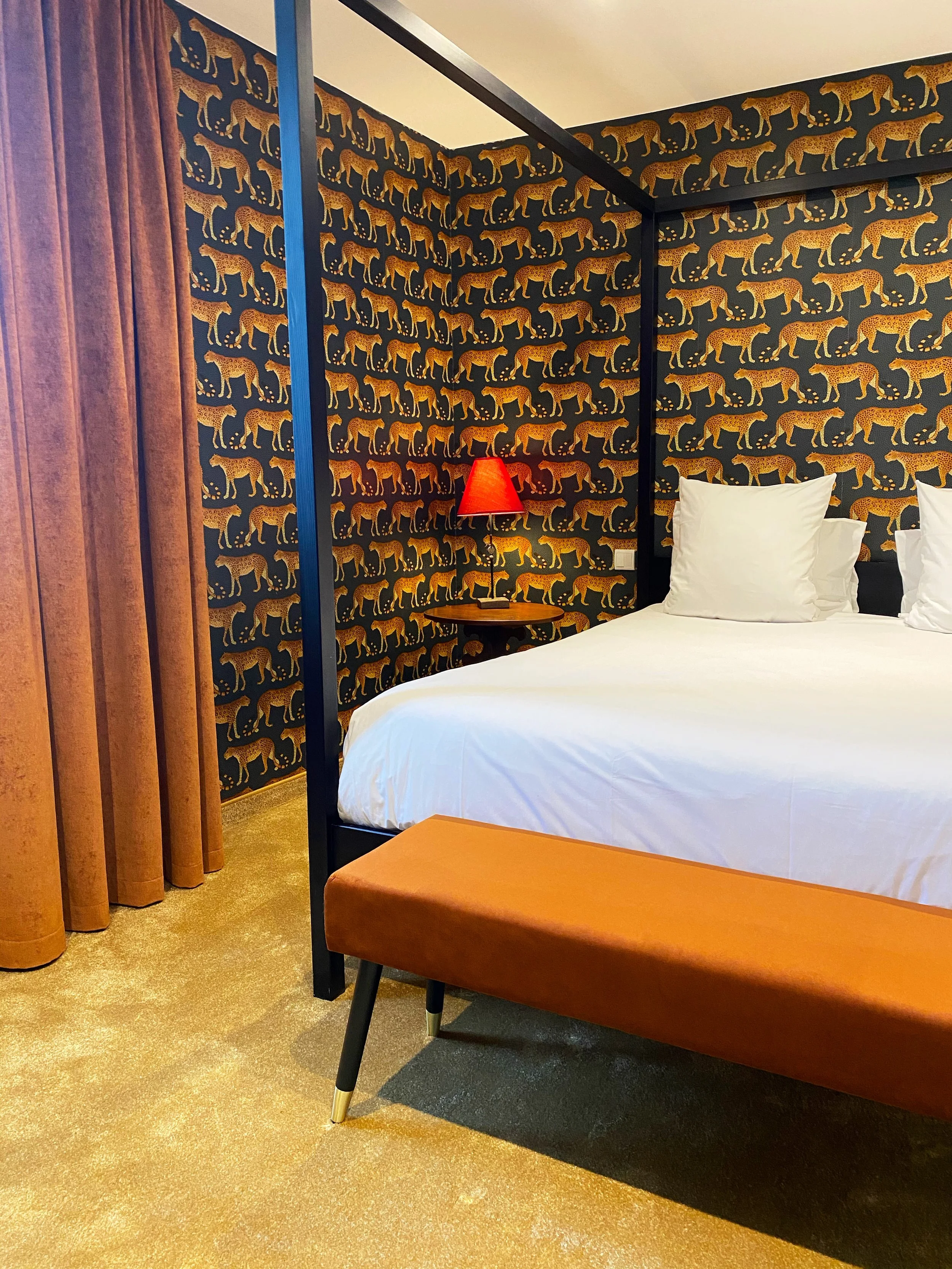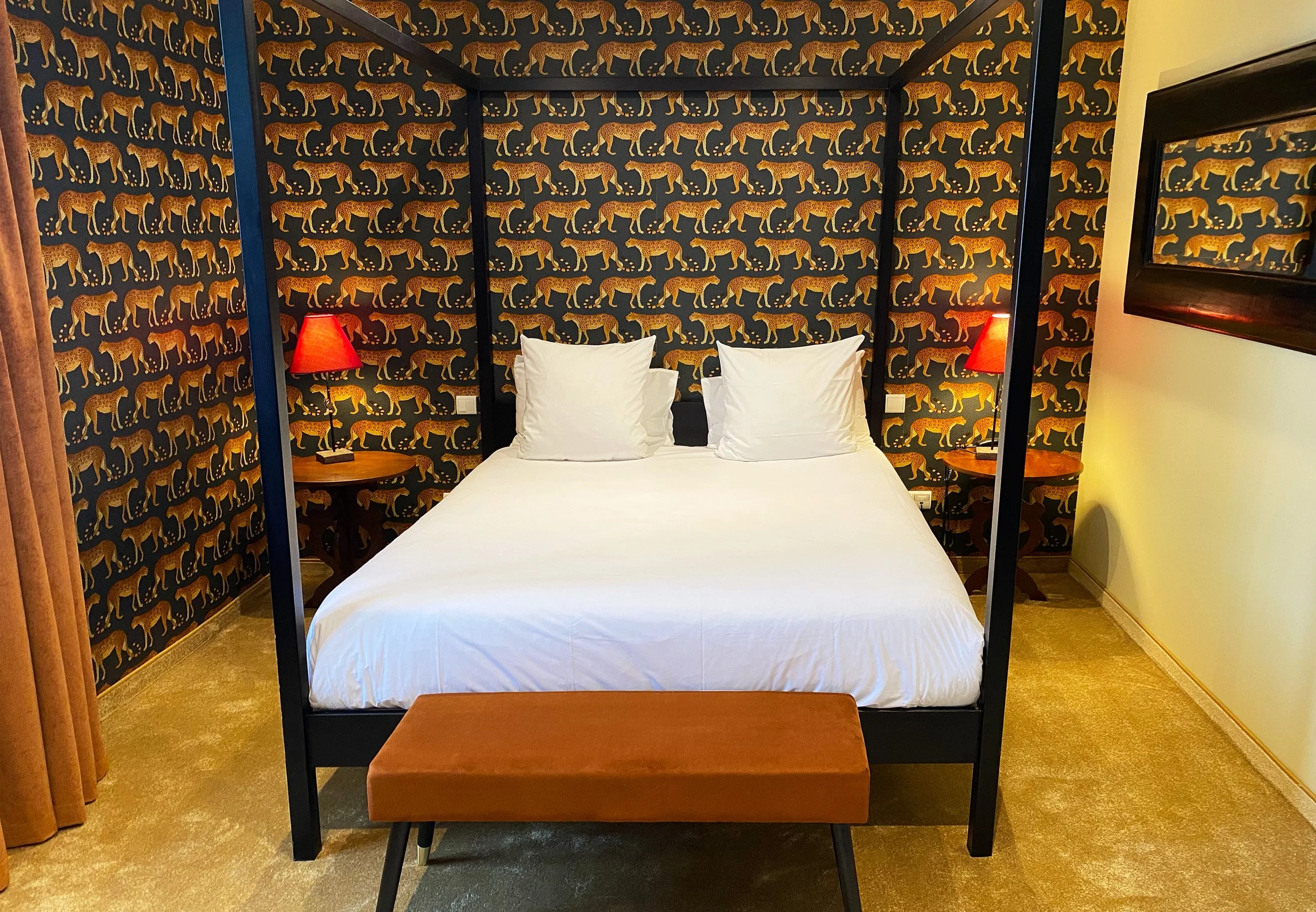 Caractère et tempérament de cette chambre où le noir et l’ambre se marient tout en harmonie.